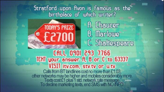 Dickinson Real Deal on ITV. Free entry here. Wednesday 14th November 2012. Enter today’s competition at no risk to your pocket for your chance to win a cash prize worth £2,700. You’ll never have to log-in for use of this website. We will never require any payment from you.