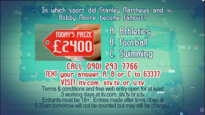 Please don’t use the comments box at the bottom of each page for your competition entries. Entries will only be accepted at the ITV website using the Pink button or the website link below that.