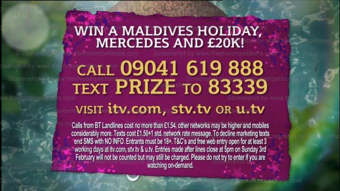 Win £20,000 cash , a Mercedes Cabriolet and a 14 Night Maldives trip with This Morning competition January 28th 2013.