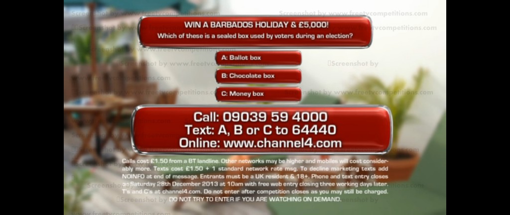 Entrants must be aged 18 years or over. Channel 4 reserves the right to disallow entries if they have reasonable grounds to suspect they have been made from outside the UK.