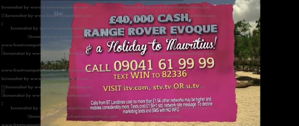 4 thoughts on “This Morning Prize Draw Competition – Win £40000 – Mauritius Holiday & Range Rover – Ends 31/1/14”
