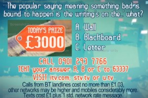 In today’s competition broadcast on ITV, STV & UTV, TV viewers or website visitors are permitted 3 (three) free ITV.com website entries using the links provided.