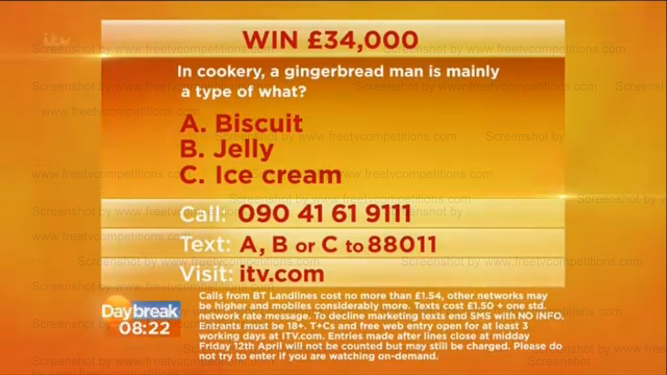 Daybreak and Lorraine competition. You can enter here for free with ITV, STV or UTV.  This weeks free competition allows for 6 (six) free entries, each with the chance to win £34,000.  Free entry is available from Monday 8th April 2013.
