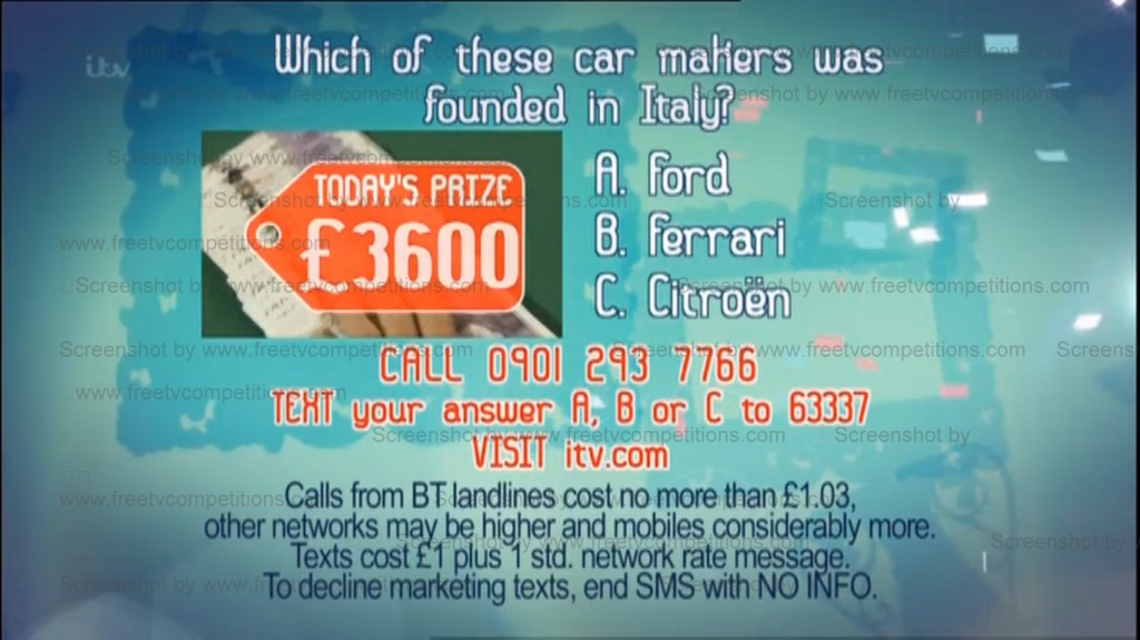 Prize for ITV show quiz broadcast on Thursday 3rd October 2013.
